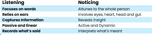 Noticing expands your awareness and sharpens your presence. It gives you richer data — from your head, heart, and gut — to guide what you do next: whether that’s asking a question, holding silence, or challenging an assumption.